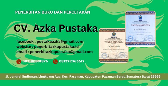 Perkenalkan kami adalah penerbit CV Azka Pustaka sebuah lembaga penerbitan dan percetakan yang terletak di Kabupaten Pasaman Barat Sumatera Barat, yang mempunyai tujuan untuk memenuhi kebutuhan para pendidik Indonesia dalam hal penerbitan dan percetakan buku, baik buku ajar, refrensi, dan penelitian dijadikan buku, dimana kami hadir untuk membantu pelaksanaan Tri Dharma Perguruan Tinggi, untuk mengabdi bagi bangsa dan Negara demi meningkatkan kualitas pendidikan Indonesia lebih maju dan berkembang.